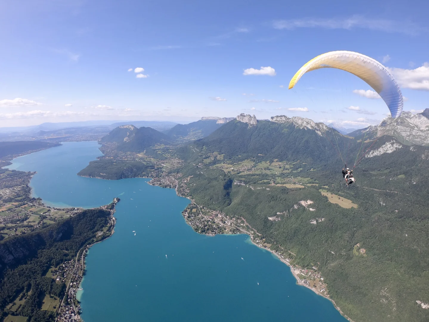 Once in the air, settle comfortably into your harness. You are seated in front of the pilot, who is behind you, and the landscape is spread out before you. The turquoise lake below, Annecy in the background, the alpine villages, the majestic mountains... It's time to enjoy the moment to the fullest.